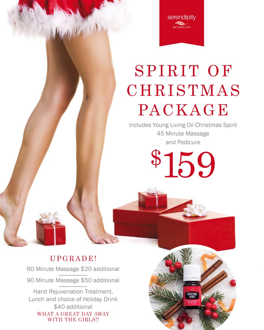 Experience the Spirit of Christmas Package! $159 includes a 45-minute massage and a pedicure Upgrade your package: $20 - 60-minute massage $50 - 90-minute massage $40 - Hand rejuvenation treatment, lunch, and choice of holiday drink!