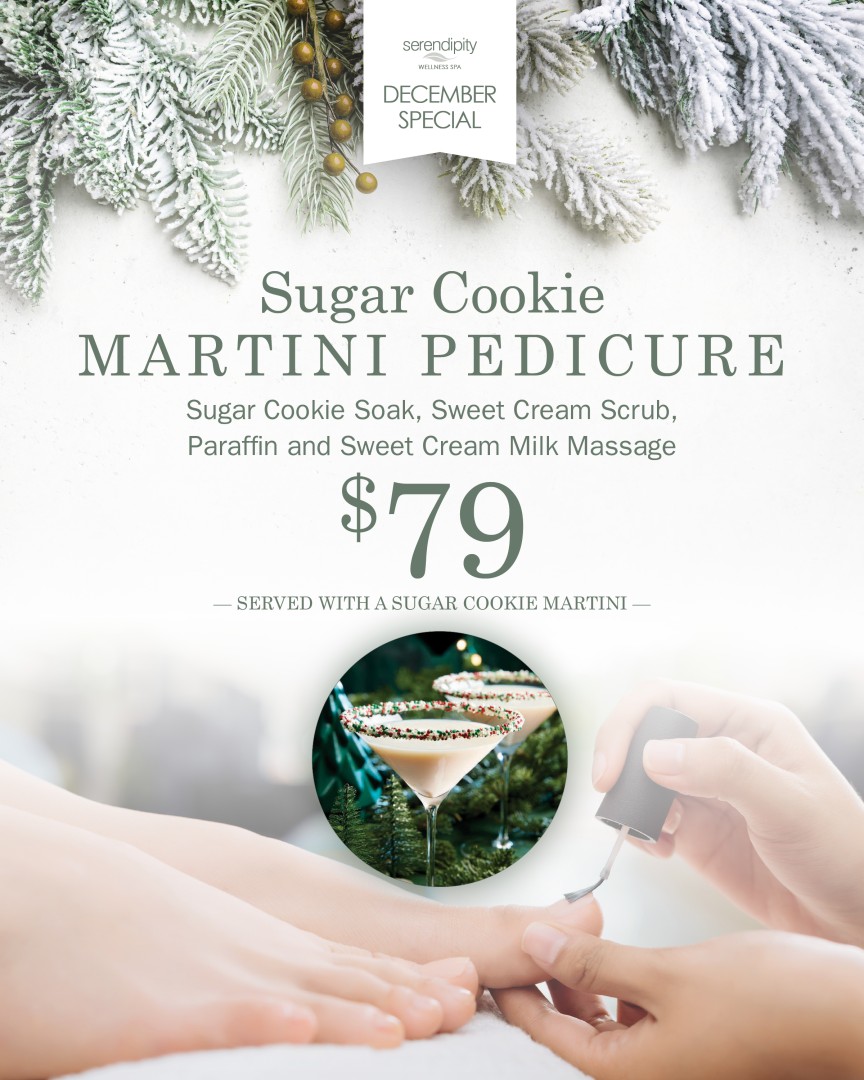 Enjoy a sugar cookie soak, sweet cream scrub, paraffin, and a sweet cream milk massage for $79. Served with a sugar cookie martini!