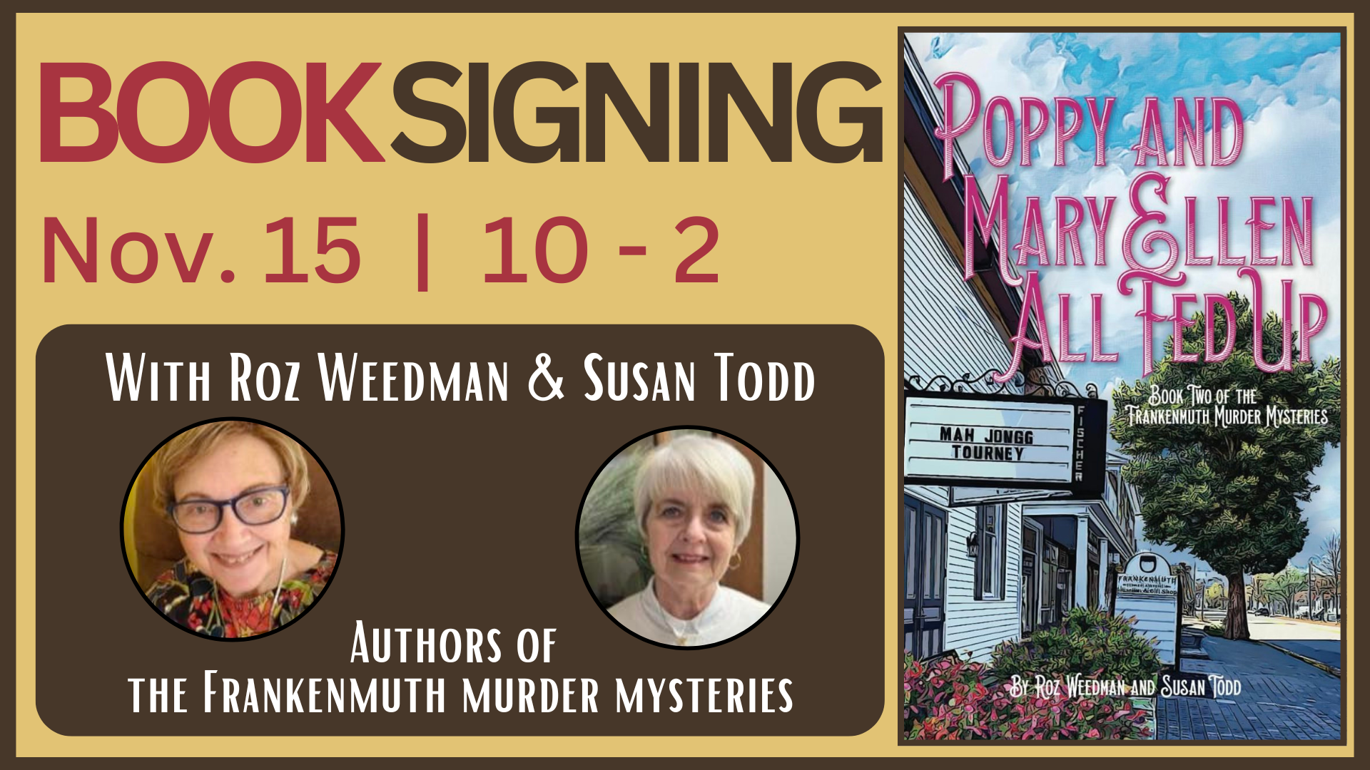 Join us at the Covered Bridge Shop on Friday, November 15th from 10 AM to 2 PM for a special book signing with local authors Roz Weedman and Susan Todd, the duo behind the Frankenmuth Murder Mysteries!