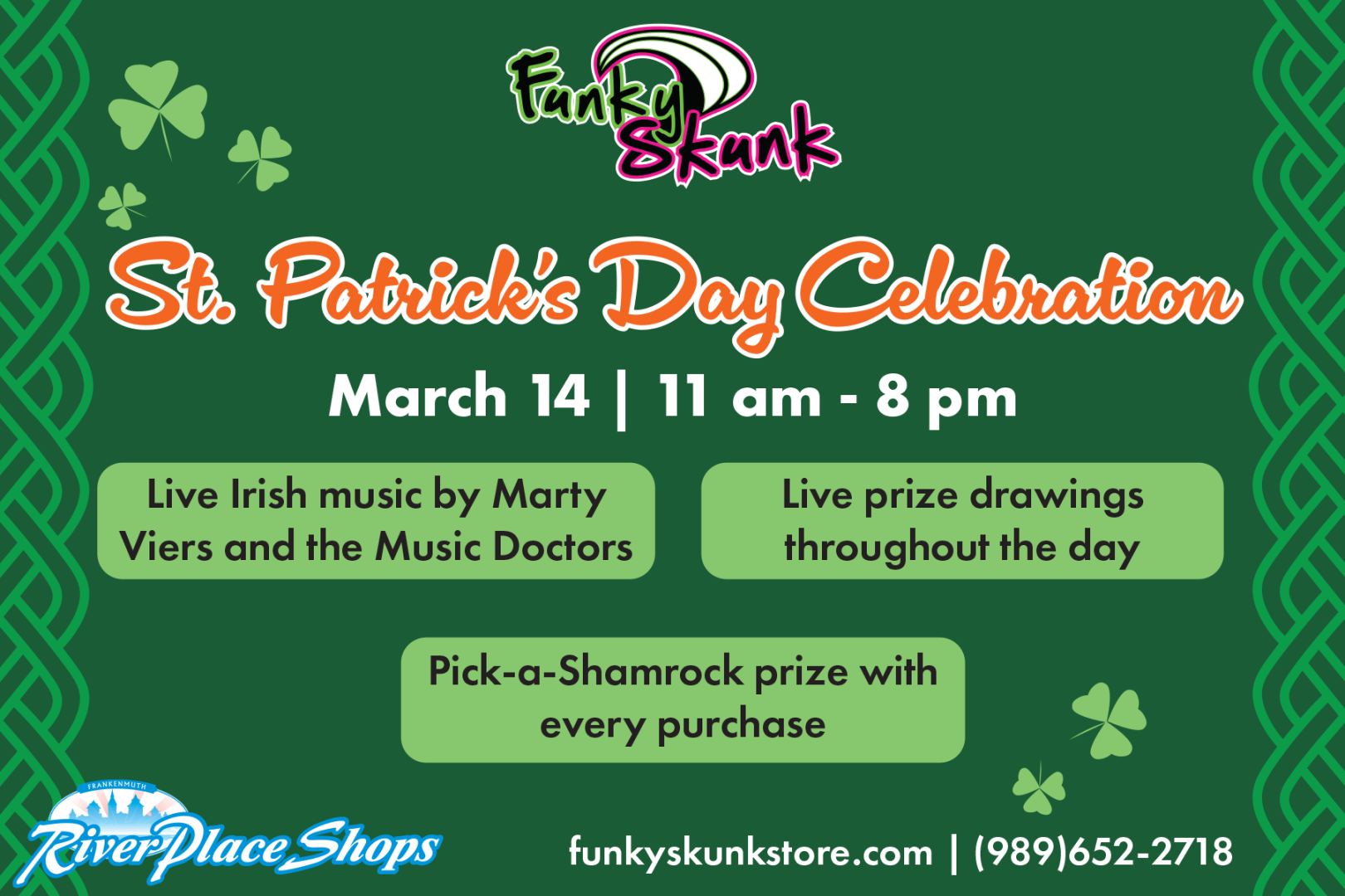 Get ready for a full day of lucky fun, music, and prizes! Join us March 14th from 11 AM – 8 PM for a festive celebration you won’t want to miss.