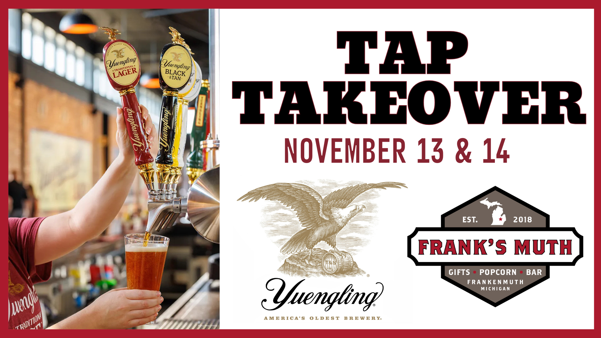 Raise a glass at Frank’s Muth! Join us November 13th & 14th for a Yuengling Tap Takeover with free popcorn and hot pretzel samples (10 AM–8 PM Thursday, 10 AM–9 PM Friday).